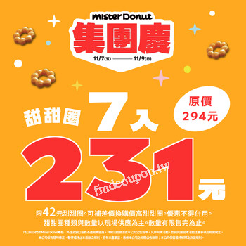 至MisterDonut實體門市,即可享甜甜圈7入231元優惠
