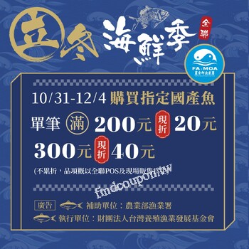 買指定國產魚品項,單筆滿200元現折20元,滿300元現折40元