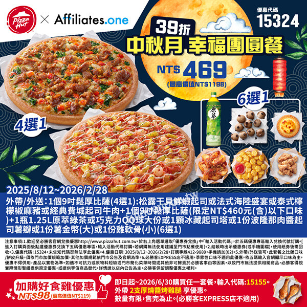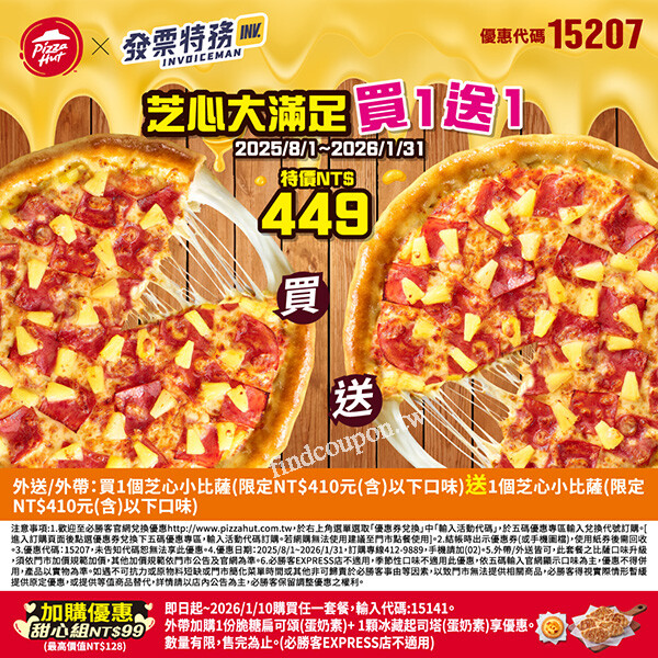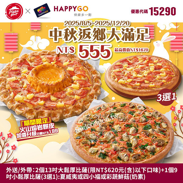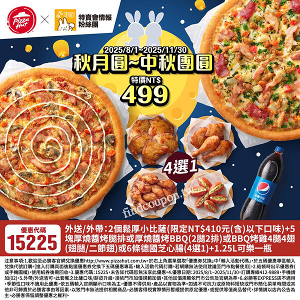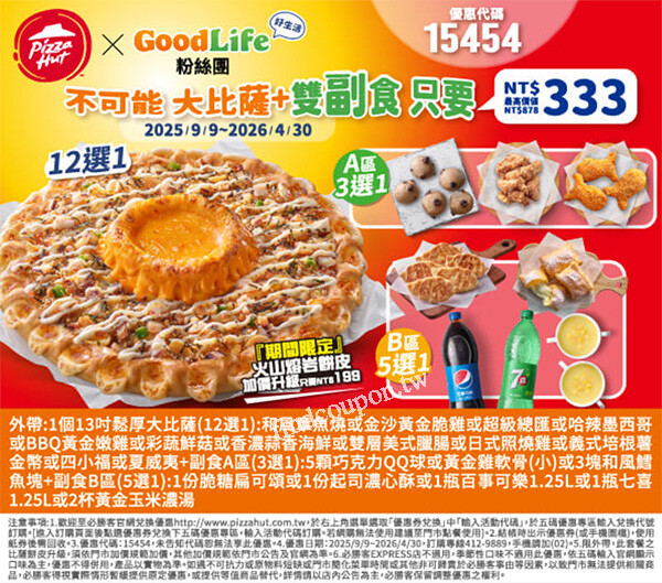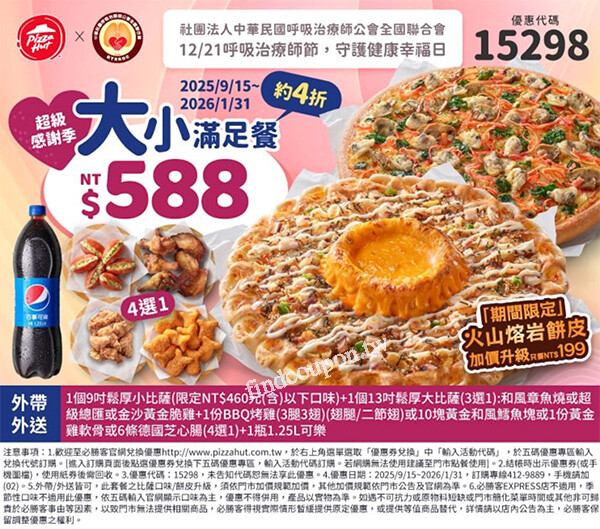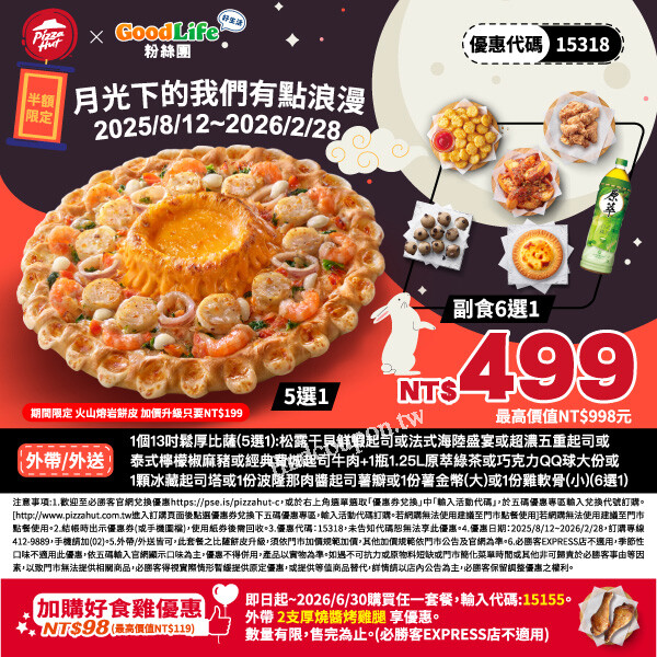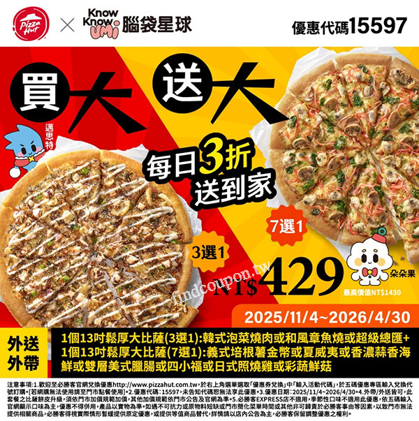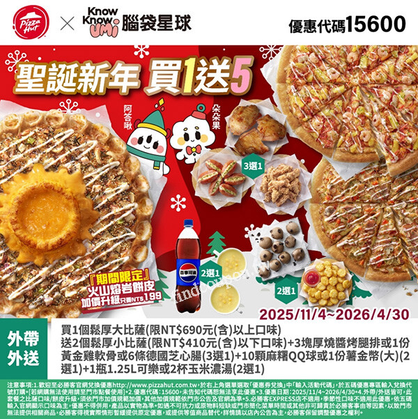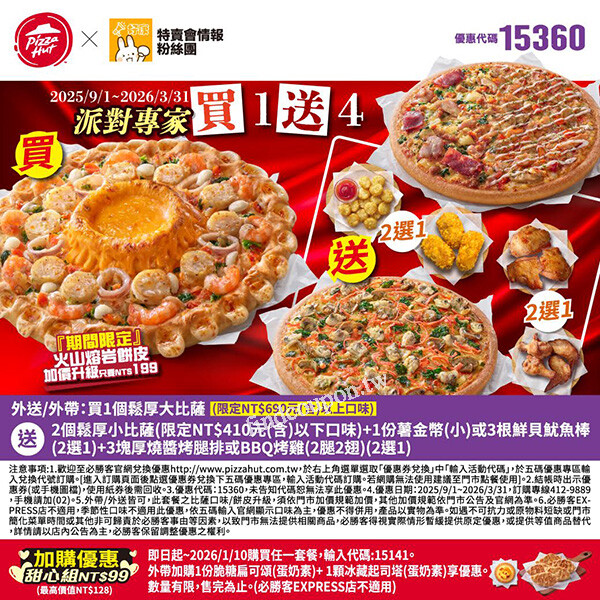 外帶和外送皆可 • 1個鬆厚大比薩(限定NT$690元(含)以上口味) • 2個鬆厚小比薩(限定NT$410元(含)以下口味) • 2選1:1份薯金幣(小) 或 3根鮮貝魷魚棒 • 2選1:3塊厚燒醬烤腿排 或 BBQ烤雞(2腿2翅) |