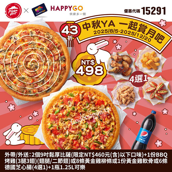 外帶和外送皆可 • 2選1:2個鬆厚小比薩(限定$410以下口味) • 4選1:5塊厚燒醬烤腿排 或 厚燒醬烤BBQ 或 BBQ烤雞4腿4翅 或 6條德國芝心腸 • 1.25L可樂1瓶 |
