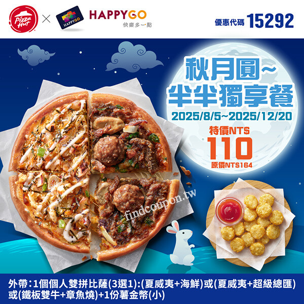 • 3選1:1個個人雙拼比薩 ***(夏威夷+海鮮)或(夏威夷+超級總匯)或(鐵板雙牛+章魚燒) • 1份薯金幣(小) |