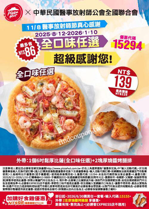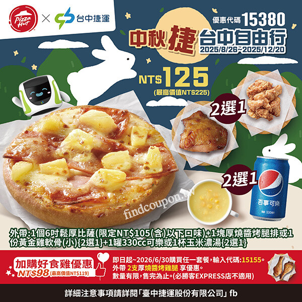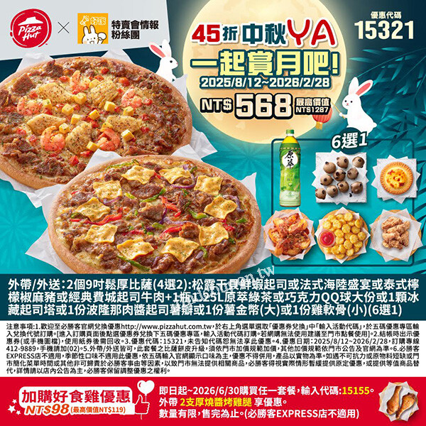 • 1個6吋鬆厚比薩(限定$150以下口味) • 2選1:1塊厚燒醬烤腿排 或 1份黃金雞軟骨(小) • 2選1:1罐可樂330cc 或 1杯玉米濃湯 |