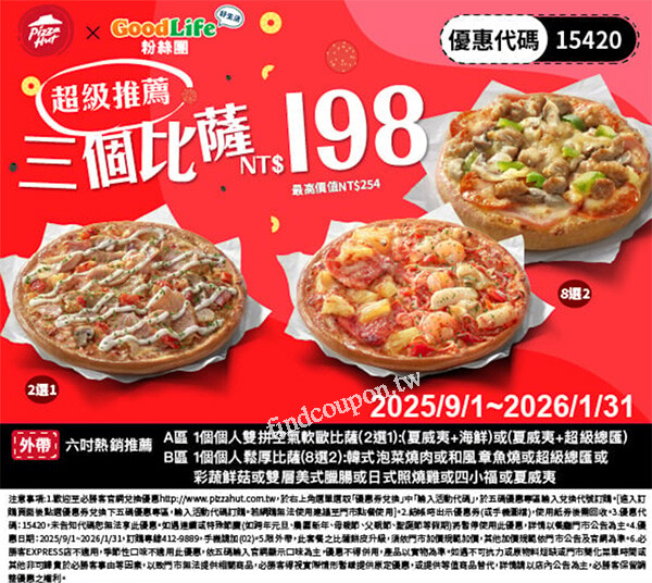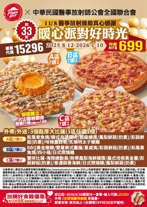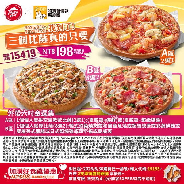 3個指定6吋個人鬆厚比薩優惠價$198 • A區5選1:和風章魚燒 或 鐵板雙牛 或 超級總匯 或 泡菜燒肉 或 炙燒明太子嫩雞 • B區3選1:日式照燒雞 或 四小福 或 雙層美式臘腸 • C區2選1:彩蔬鮮菇 或 或 夏威夷 |