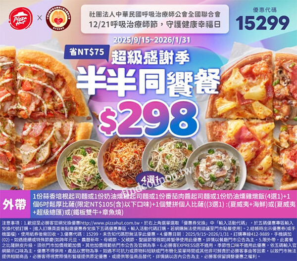• 1個6吋個人鬆厚比薩(限定$105以下口味) • 3選1:1個雙拼個人比薩 ***(夏威夷+海鮮)或(夏威夷+超級總匯)或(鐵板雙牛+章魚燒) • 4選1:1份蒜香培根起司麵 或 奶油燻雞起司麵 或 番茄肉醬起司麵 或 奶油燻雞燉飯 |