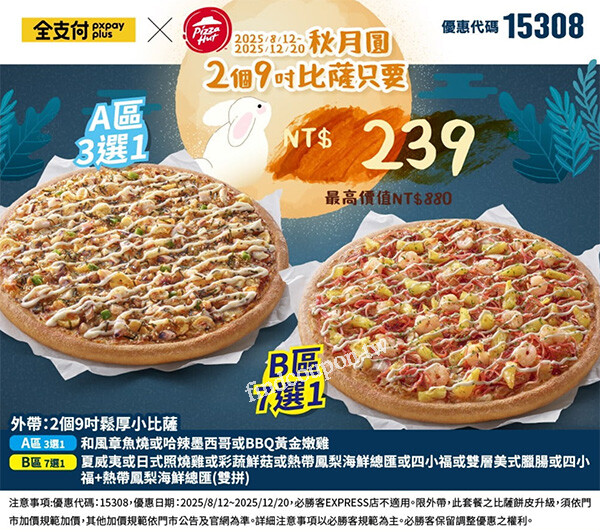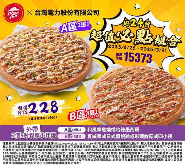 2個6吋個人鬆厚比薩=$129 A區- 和風章魚燒 或 鐵板雙牛比薩 或 韓式泡菜燒肉 或 彩蔬鮮菇 B區- 夏威夷 或 式照燒雞 或 彩蔬鮮菇 |