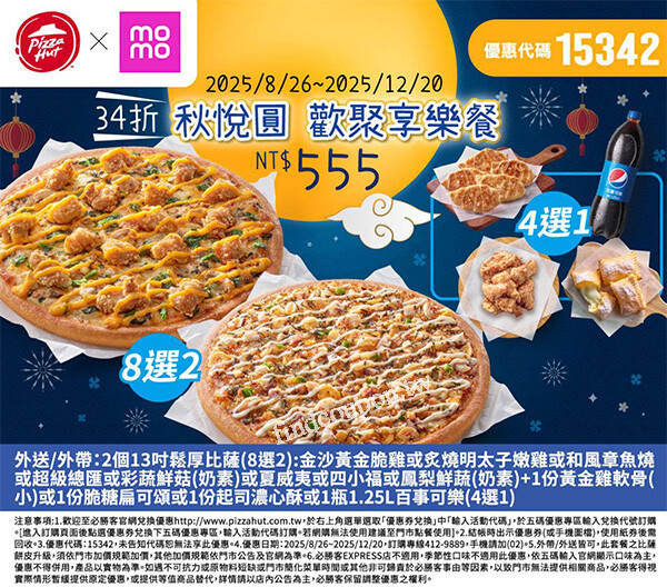 外帶和外送皆可 • 8選2:2個13吋鬆厚大比薩 *** 金沙黃金脆雞 或 炙燒明太子嫩雞 或 和風章魚燒 或 超級總匯 或 彩蔬鮮菇 或 夏威夷 或 四小福 或 鳳梨鮮蔬 • 4選1:1份黃金雞軟骨 或 1份脆糖扁可頌 或 1份起司濃心酥 或 1.25L百事可樂 |