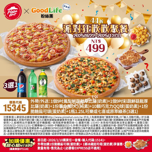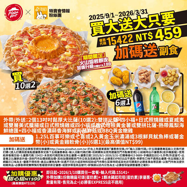 外帶和外送皆可 • 1個鬆厚大比薩(限定NT$690元(含)以上口味) • 2個鬆厚小比薩(限定NT$410元(含)以下口味) • 3選1:3塊厚燒醬烤腿排 或 1份黃金雞軟骨 或 6條德國芝心腸 • 2選1:10顆麻糬QQ球 或 1份薯金幣(大) • 2選1:1瓶1.25L可樂 或 2杯玉米濃糖 |