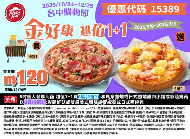 2個指定6吋個人鬆厚比薩優惠價$120 • A區4選1:和風章魚燒 或 日式照燒雞 或 四小福 或 彩蔬鮮菇 • B區4選1:彩蔬鮮菇 或 雙層美式臘腸 或 夏威夷 或 日式照燒雞 |