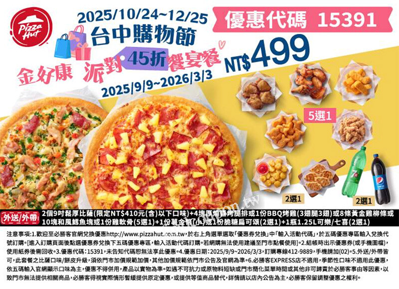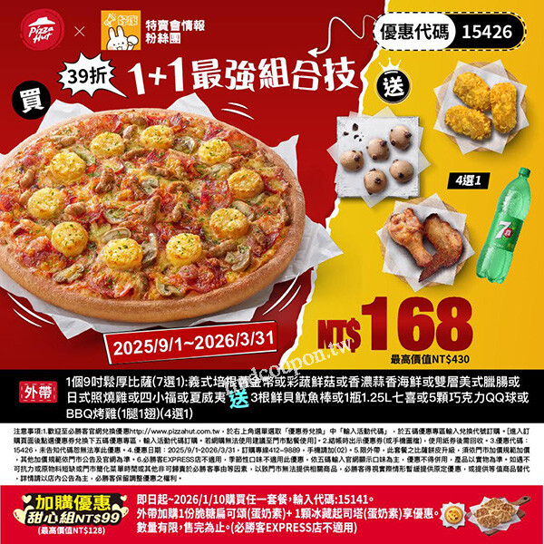 • 1個9吋鬆厚比薩(限定NT$410元(含)以下口味) • 3選1:1.25L可樂一瓶 或 原萃綠茶 或 七喜 • 2選1:4支厚燒醬烤雞腿 或 8條黃金雞柳條 |