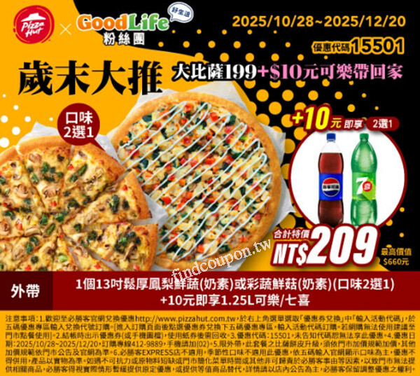 • 2選1:1個13吋鬆厚比薩 *** 鳳梨鮮蔬(奶素) 或 彩蔬鮮菇(奶素) • 2選1:1瓶1.25L百事可樂 或 七喜 |