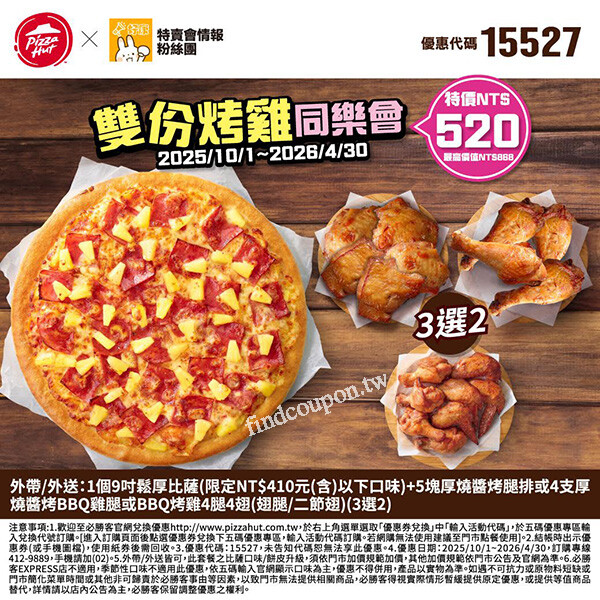 外帶和外送皆可 • 1個9吋鬆厚比薩(限定NT$410元(含)以下口味) • 3選2:5塊厚燒醬烤腿排 或 4支厚燒醬烤BBQ雞腿 或 BBQ烤雞4腿4翅(翅腿/二節翅) |