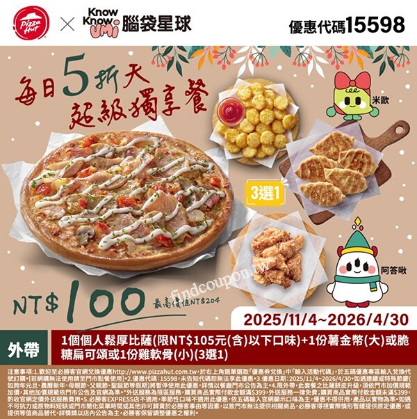 • 1個個人鬆厚比薩(限$105以下口味) • 3選1:1份薯金幣(大) 或 1份雞軟骨(小) 或 脆糖扁可頌 |