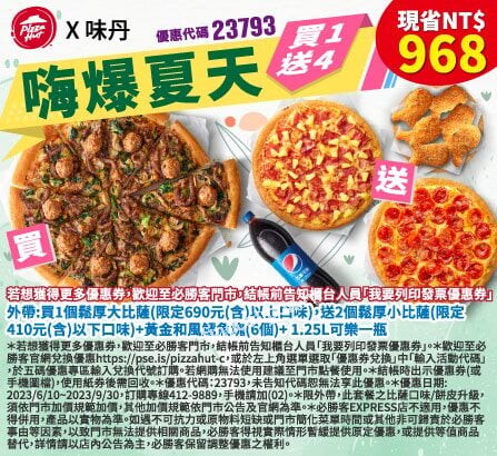 外送/外帶 • 3個大鬆厚比薩(限NT$620(含)以下口味) • 4選1:1瓶1.25L七喜 或 1瓶1.25L百事可樂 或 1瓶1.25L原萃綠茶 或 2杯玉米濃湯 |