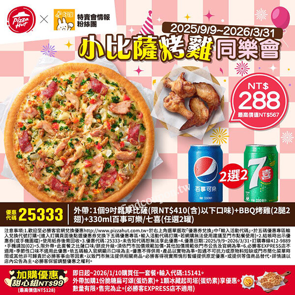 • 1個9吋鬆厚比薩(限NT$410(含)以下口味) • BBQ烤雞(2腿2翅) • 330ml百事可樂/七喜(任選2罐) |