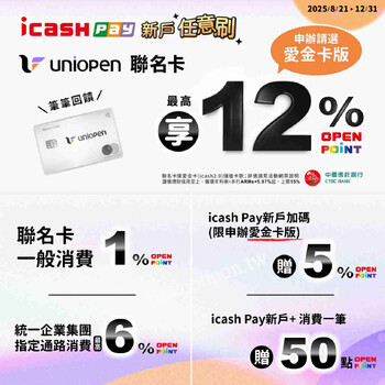 搭配icash Pay新戶加碼疊加,筆筆消費最高享12% OPENPOINT回饋