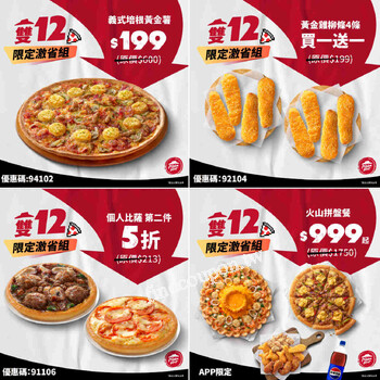 New 必勝客雙12限定激省組,副食買1送1、個人比薩第二件5折