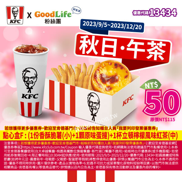 6個原味蛋撻+20塊上校雞塊+2杯經典冰奶茶(小)=優惠價345元(原價568元) |