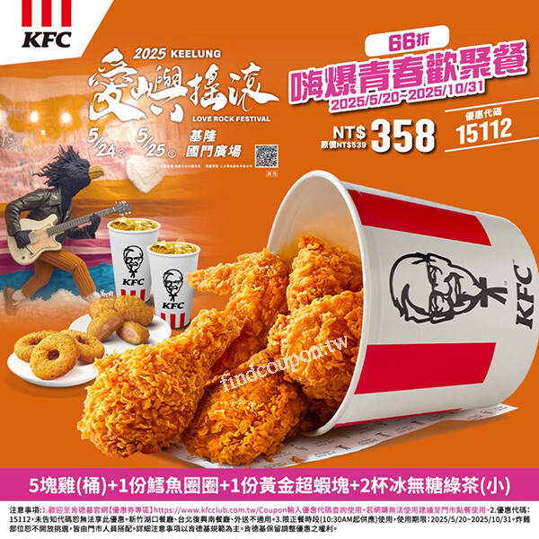 1份韓式起司脆雞飯+3個原味蛋撻+1個咔啦雞腿堡+4塊上校雞塊+1杯冰無糖綠茶(小)=優惠價299元(原價414元) |