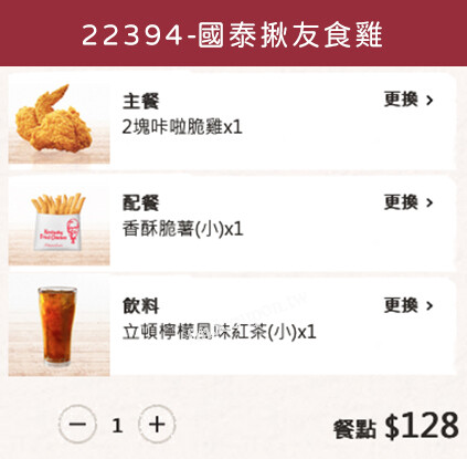1個咔啦脆雞+4塊上校雞塊+1份香酥脆薯(小)+1杯冰無糖綠茶(小)=優惠價115元(原價193元) |