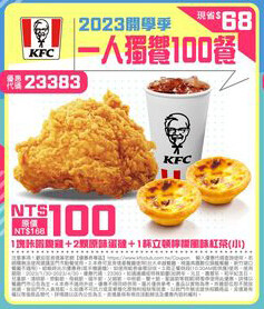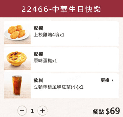 1個吮指嫩雞蛋堡+1個原味蛋撻+1份香酥脆薯(小)+1杯立頓檸檬風味紅茶(小)=優惠價109元(原價178元) |