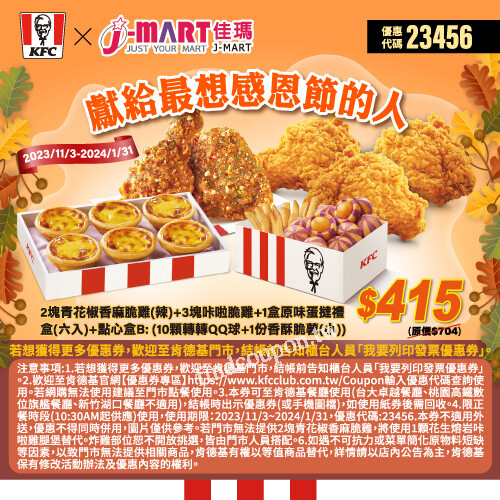 5個咔啦脆雞+2個原味蛋撻+4塊上校雞塊+1份香酥脆薯(小)+2杯無糖綠茶(小)=優惠價369元(原價604元) |
