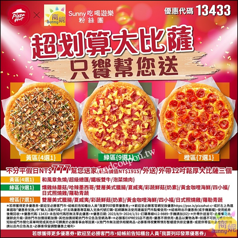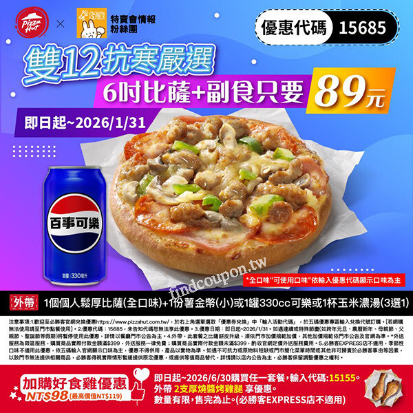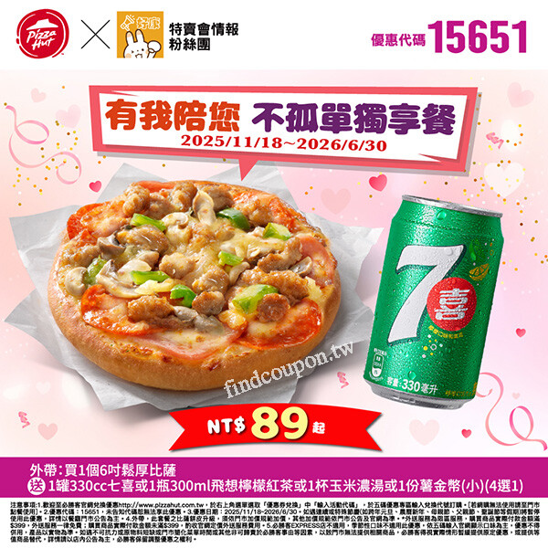 • 1個個人鬆厚比薩(全口味) • 3選1:1份薯金幣(小) 或 1罐330cc可樂 或 1杯玉米濃湯 附註:*全口味”可使用口味”依輸入優惠代碼顯示口味為主 |