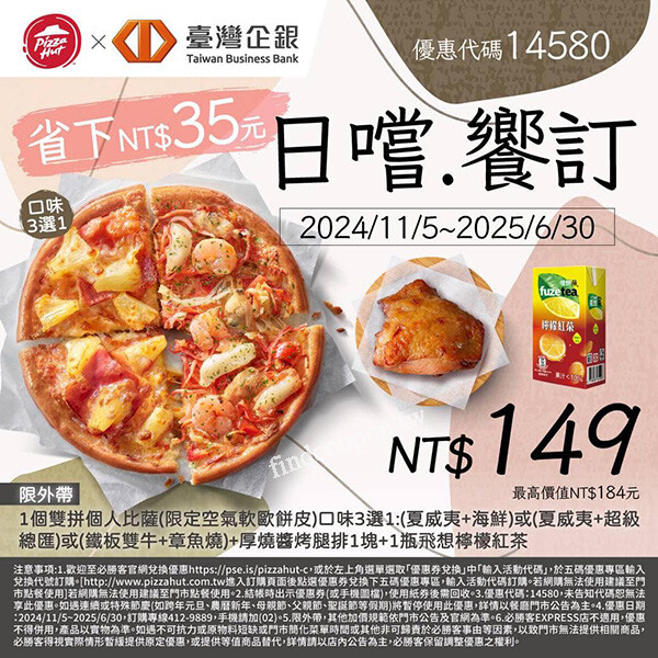 • 1個6吋鬆厚比薩(限定$150以下口味) • 2選1:1塊厚燒醬烤腿排 或 1份黃金雞軟骨(小) • 2選1:1罐可樂330cc 或 1杯玉米濃湯 |