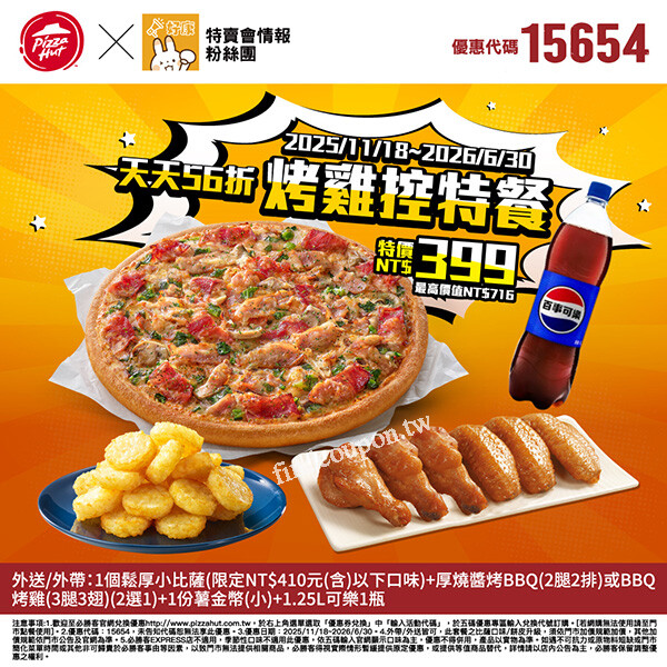 外送/外帶 • 1個鬆厚小比薩(限定NT$410元(含)以下口味) • 2選1:厚燒醬烤BBQ(2腿2排) 或 BBQ烤雞(3腿3翅) • 1份薯金幣(小) • 1.25L可樂1瓶 |