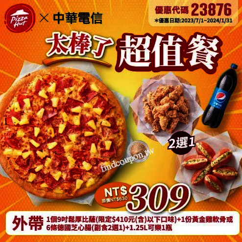 • 1個9吋鬆厚比薩(限定NT$410元(含)以下口味) • 3選1:1.25L可樂一瓶 或 原萃綠茶 或 七喜 • 2選1:4支厚燒醬烤雞腿 或 8條黃金雞柳條 |