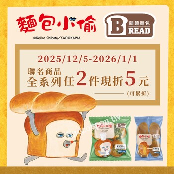 即日起到2026/1/1,麵包小偷聯名品項,任2件現折5元